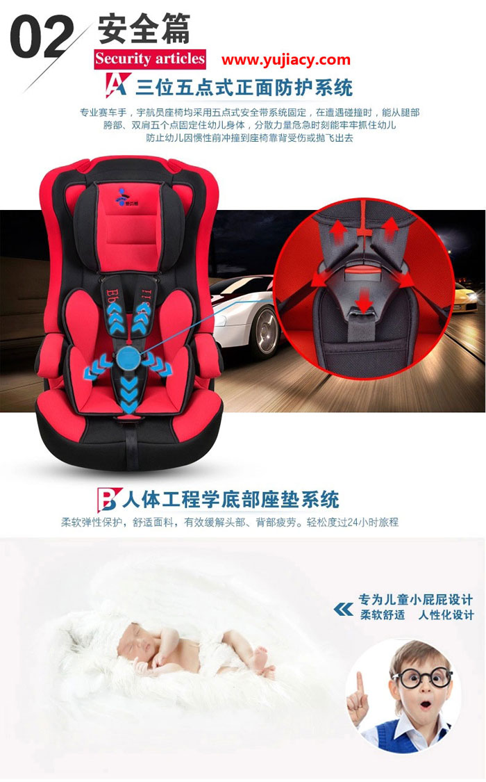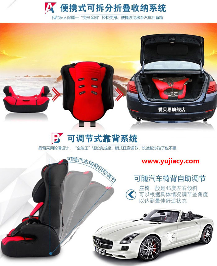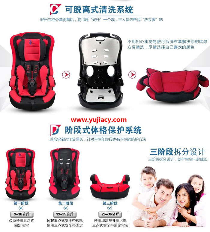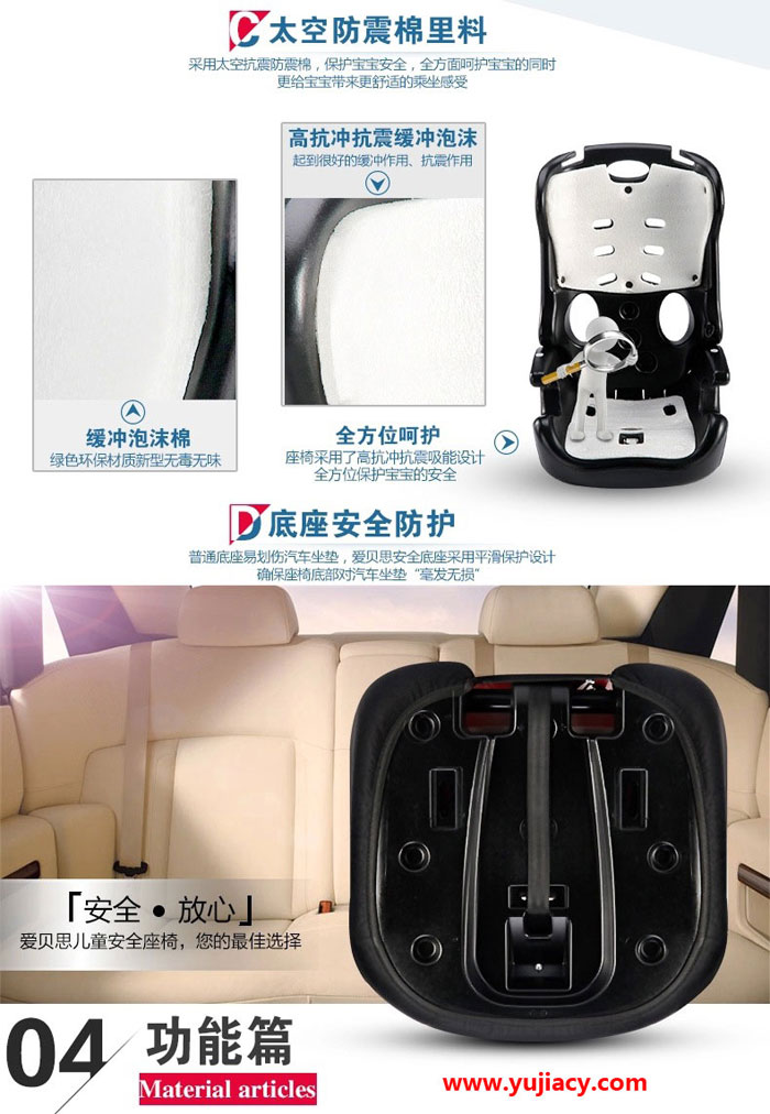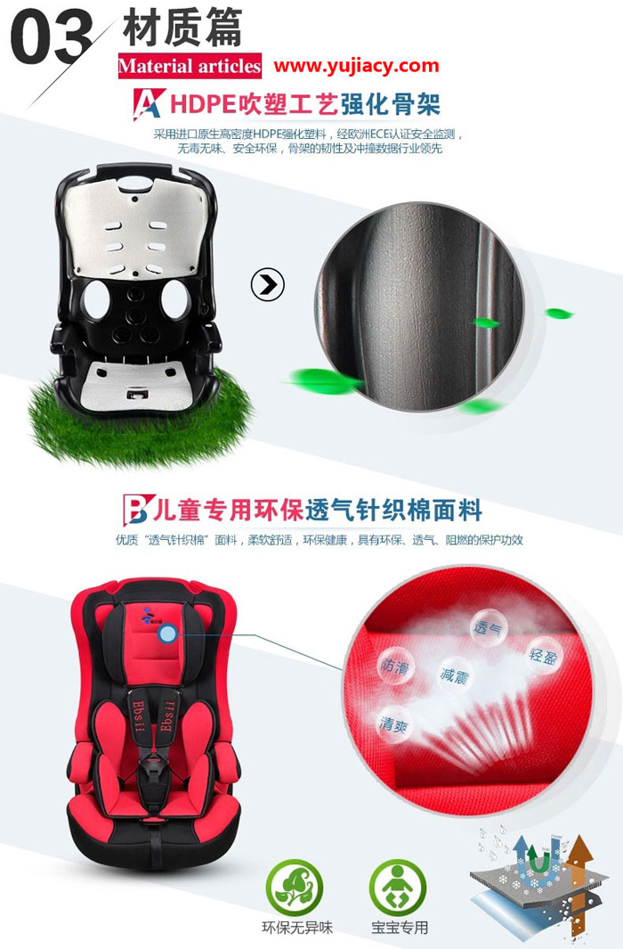 爱贝思(Ebsii)儿童座椅更耐光、耐磨,色牢度强,并具有环保、透气、阻然功能。有弹性,锁边牢固,不会脱落。高密度太空棉,冲击吸力特强,缓解行车时产生的颠簸令宝宝乘坐无比舒适。