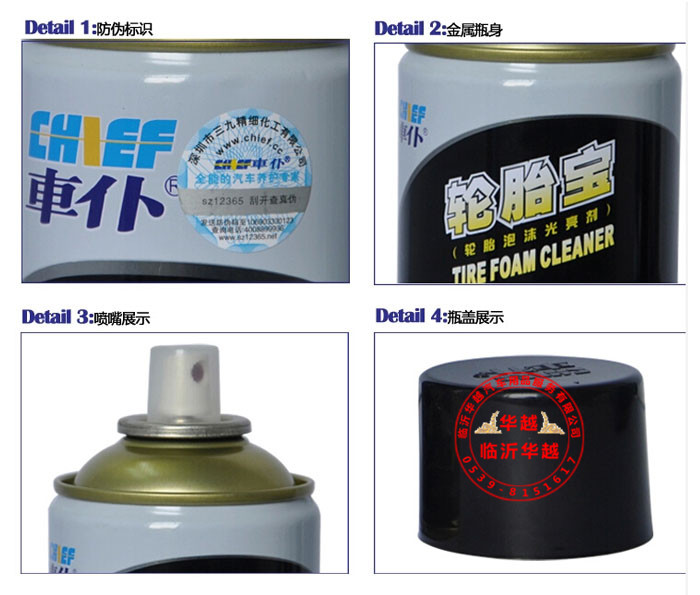 本品富含强力清洁泡沫,渗透、清洁、上光、保护轮胎一次完成。能彻底去除轮胎上的渍、污垢等。独有的抗紫外线剂能防止轮胎老化、龟裂和褪色。可适用于轮胎、防撞杆、胶边等,使用后可恢复轮胎乌黑的光泽,还原如新。