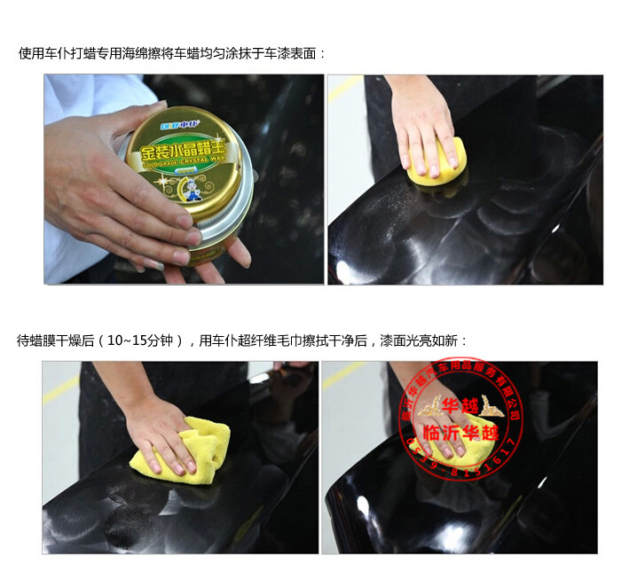 先洗净车身的污泥和灰尘,并用毛巾擦净水滴。如车漆表面仍有污渍、先用车仆光辉水蜡或速效软蜡清除车身污渍。用海绵蘸取本蜡薄薄均匀地涂于车身表面,等蜡膜干燥后(5-10分钟),用超细纤维方巾或纯棉毛巾擦拭干净。